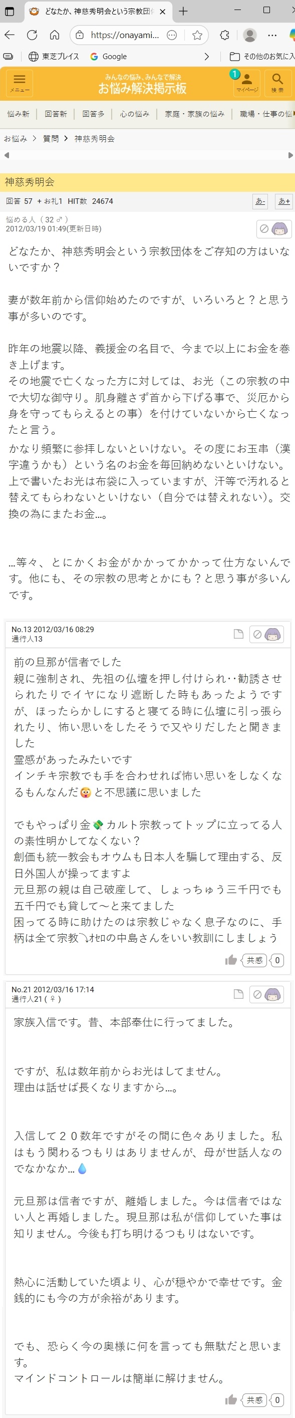教えて!goo 秀明会”私は結婚して夫が信仰している神慈秀明会の信者に”(2023/10/11)より
